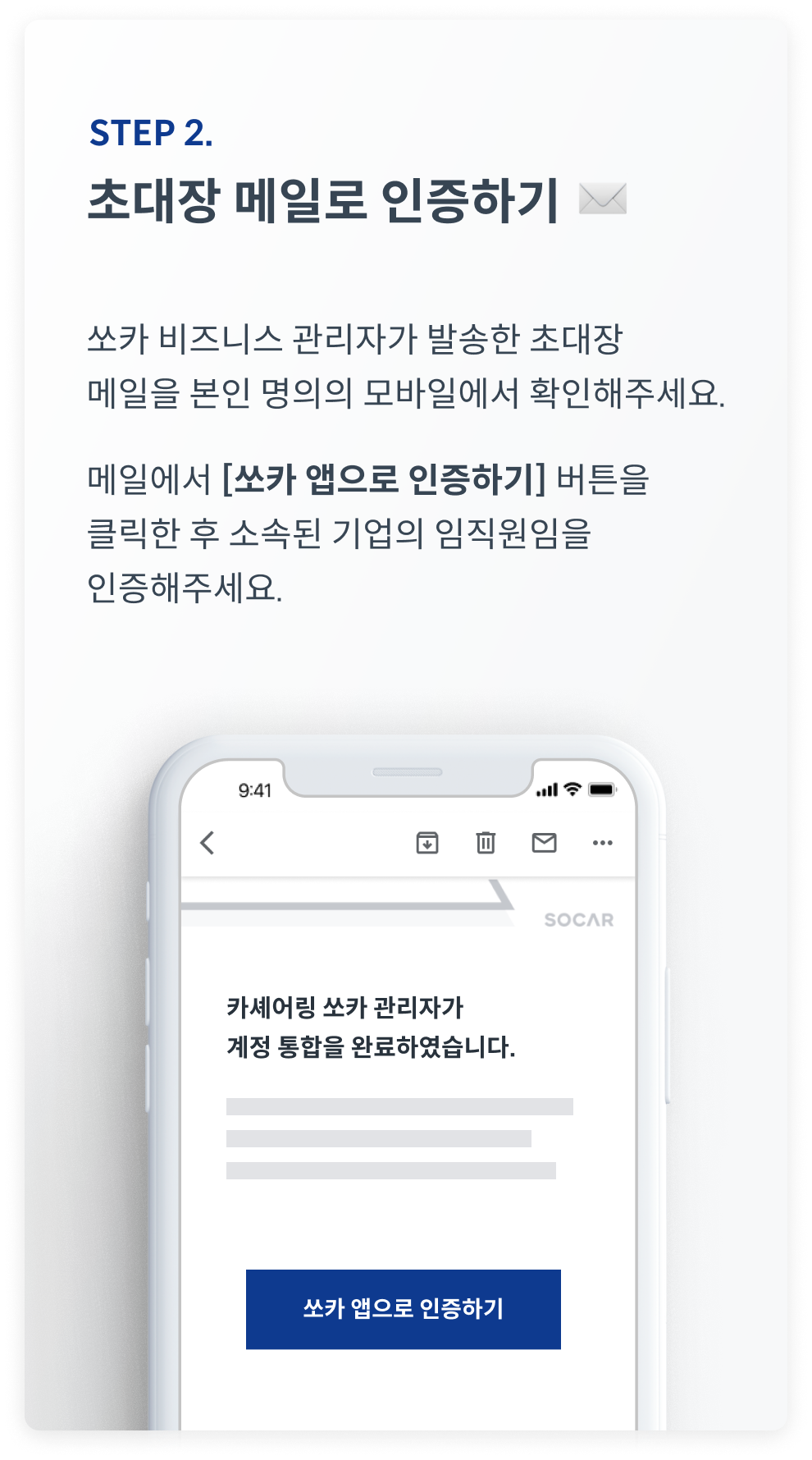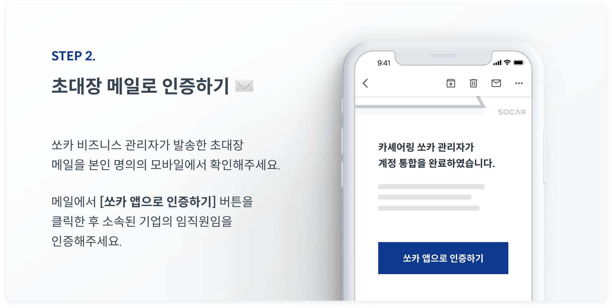 초대장은 쏘카 비즈니스 관리자의 계정 통합이 완료될 시 발송됩니다.