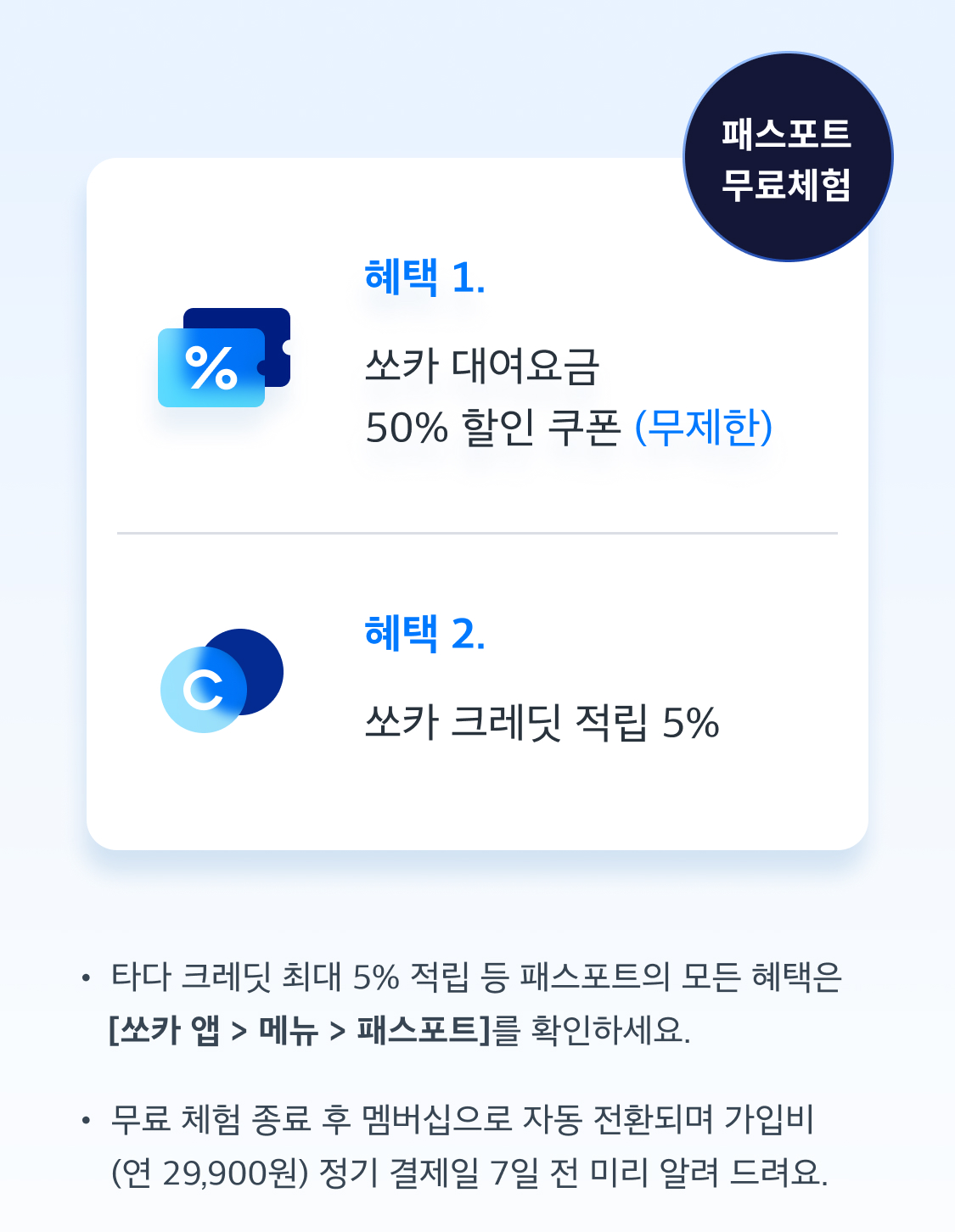 - 패스포트 무료 체험은 쏘카 앱에서 제공됩니다. (타다 앱 제공되지 않음)